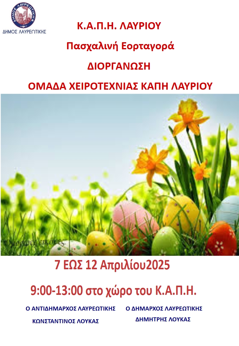 Το πασχαλινό παζάρι, ξεκινά από τη Δευτέρα 7 Απριλίου και θα διαρκέσει έως και τις 12 Απριλίου και θα πραγματοποιηθεί στον Χώρο του Κ.Α.Π.Η. (Α. Συγγρού και Ελ. Βενιζέλου, Λαύριο 195 00).