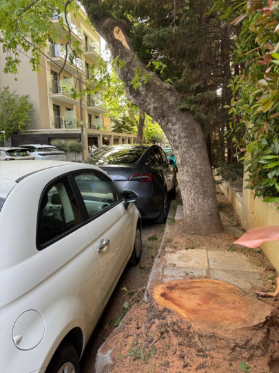 Παρακάτω όπως θα δείτε (σ.σ. στη συλλογή φωτογραφιών που ακολουθεί) οι φωτογραφίες 1 & 2 αφορούν την κοπή στην οδό Μυκόνου 3 με άδεια κοπής κατόπιν σύσσωμης απόφασης του Δημοτικού Συμβουλίου και φωτογραφίες 3, 4, 5 την πρόσφατη έκτακτη και επιβεβλημένη κοπή, λόγω πτώσης του δέντρου από την κακοκαιρία και, ευτυχώς, προσωρινής του στήριξης στο διπλανό πλατάνι.