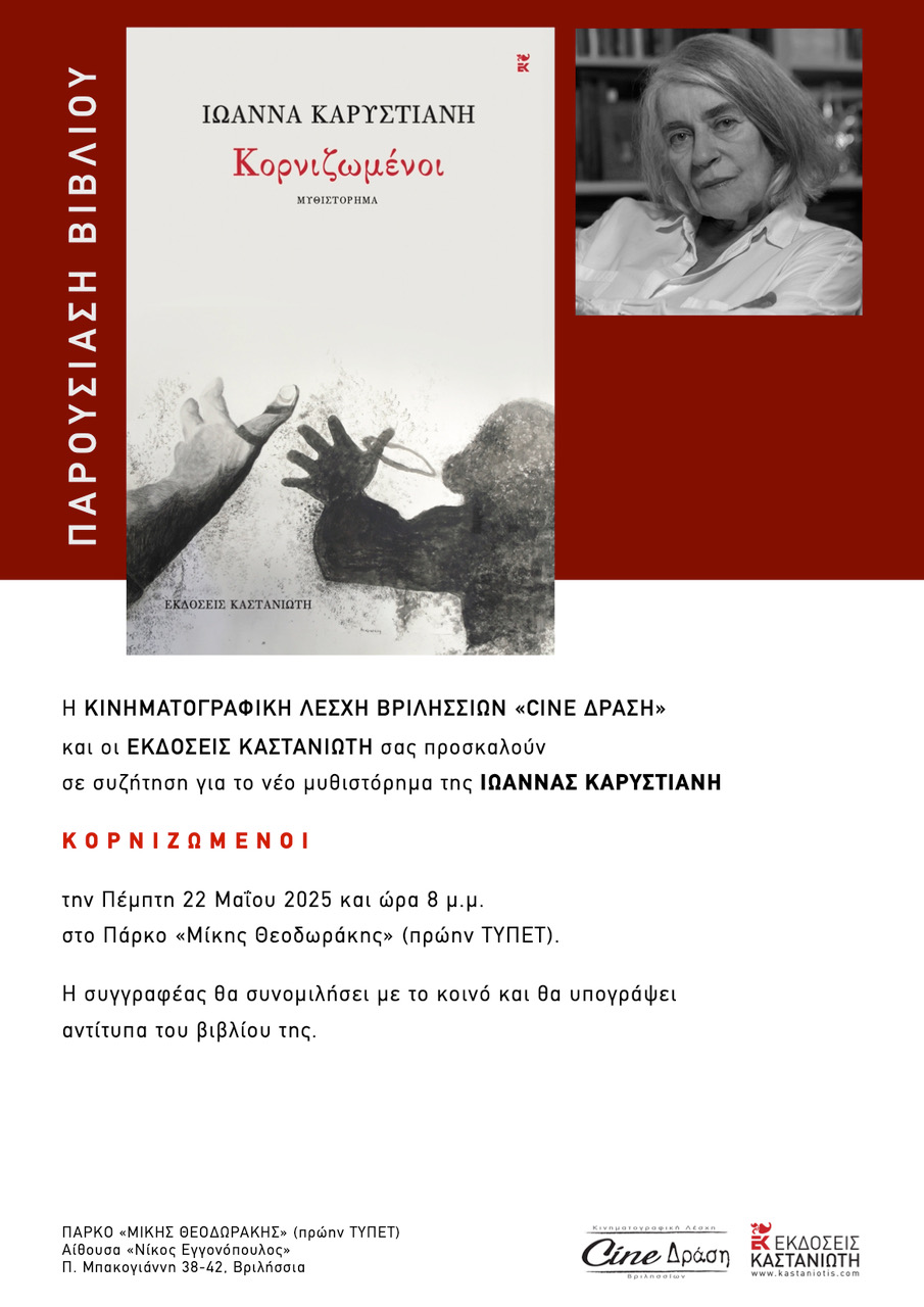 Η Κινηματογραφική Λέσχη Βριλησσίων Cine -Δράση και οι Εκδόσεις Καστανιώτη πραγματοποιούν συζήτηση για το νέο βιβλίο της Ιωάννας Καρυστιάνη «Κορνιζωμένοι», στην αίθουσα Νίκος Εγγονόπουλος, πάρκο «Μίκης Θεοδωράκης» (πρώην ΤΥΠΕΤ, Υμηττού και Πλαταιών), την Πέμπτη 22 Μαΐου στις 20.00. Η συγγραφέας θα συνομιλήσει με το κοινό και θα υπογράψει βιβλία της.