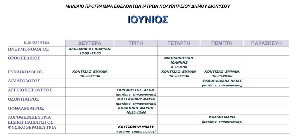 Στη διάθεση των πολιτών βρίσκεται το νέο πρόγραμμα επισκέψεων του Δημοτικού Πολυϊατρείου του Δήμου Διονύσου για τον μήνα Ιούνιο.